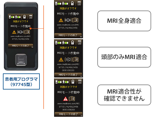 SureScan神経刺激装置はプログラミングソフトウェア(MRI-モード/ MRI-CSモード)を搭載し、MRI適合性における不確実性を低減することができます。患者用プログラマ(97740型または97745型)を用いてMRI-モード/ MRI-CSモードを起動すると、神経刺激装置にプログラムされた情報に基づき、MRIの適合性を示すシンボルを表示します。また、MRI-モード/ MRI-CSモードを起動することで神経刺激装置の出力はオフになり、MRI撮像の準備が整います2,3。